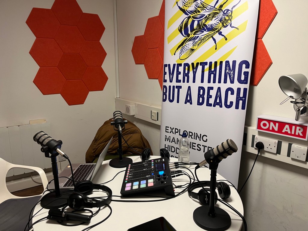 March 2025 – More episodes are being recorded. Here’s a pic of the studio (check out the old school ‘on air’ sign).